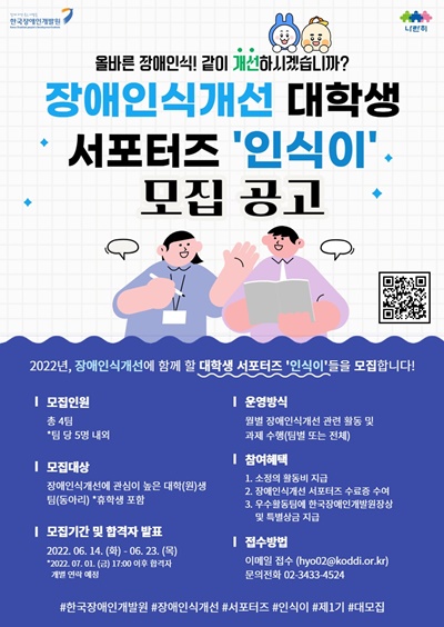 한국장애인개발원은 2022년도 장애인식개선 대학(원)생 서포터즈 ‘인식이’를 오는 23일까지 모집한다.
