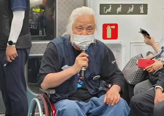 30일 서울 4호선 삼각지역에서 진행된 전국장애인차별철폐연대 42차 삭 투쟁 결의에서 발언하는 전국장애인차별철폐연대 상임공동 대표. ⓒ에이블뉴스 에이블포토로 보기▲ 30일 서울 4호선 삼각지역에서 진행된 전국장애인차별철폐연대 42차 삭 투쟁 결의에서 발언하는 전국장애인차별철폐연대 상임공동 대표. ⓒ에이블뉴스