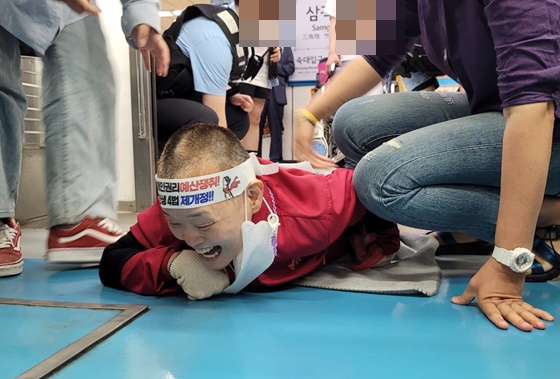 이날 삭발에 이어 4호선 삼각지역에서 혜화역까지 오체투지로 이동한 강북례 회장은 “장애인권리예산은 곧 장애인 생존권”이라고 절규했다.