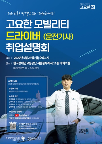 이번 설명회는 지난 4월 26일 공단 서울동부지사와 코액터스(주) 간 ‘장애인 행복드라이버(가칭) 일자리 창출 업무협약’ 체결에 따른 후속 조치로, 드라이버 채용 활성화를 위해 구직 장애인들을 대상으로 코액터스(주)만의 차별화된 근무조건과 현직 드라이버의 생생한 취업 스토리 등을 공유할 예정이다.