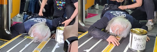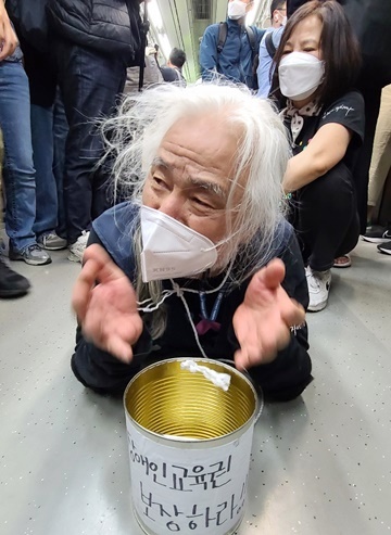 ‘장애인 탈시설권리 보장하라’ 깡통을 든 박경석 상임공동대표가 지하철 바닥을 기며 ‘장애인권리예산 보장’을 호소했다.ⓒ에이블뉴스 에이블포토로 보기▲ ‘장애인 탈시설권리 보장하라’ 깡통을 든 박경석 상임공동대표가 지하철 바닥을 기며 ‘장애인권리예산 보장’을 호소했다.ⓒ에이블뉴스