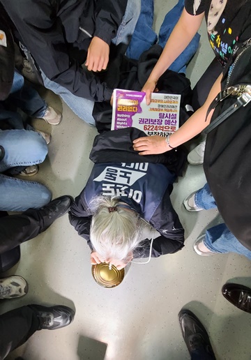 이날의 ‘오체투지’는 1시간만인 오전 9시 58분경 끝이 났다. 승강장에 사지를 뻗은 박경석 상임공동대표와 이형숙 회장의 얼굴에는 땀방울이 맺혔다. ‘정말 매일 이렇게 하실 수 있습니까?’란 질문이 절로 나왔다.