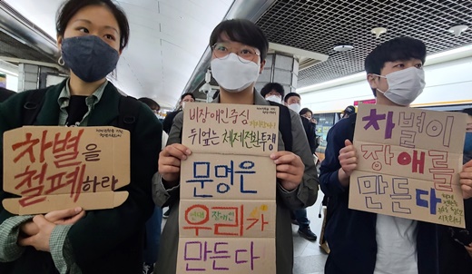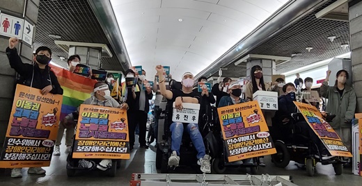 12일 서울 3호선 경복궁역 승강장(7-1)에서 열린 전국장애인차별철폐연대(전장연) 10차 삭발 투쟁 결의식에 연대한 단체들 모습.ⓒ에이블뉴스 에이블포토로 보기▲ 12일 서울 3호선 경복궁역 승강장(7-1)에서 열린 전국장애인차별철폐연대(전장연) 10차 삭발 투쟁 결의식에 연대한 단체들 모습.ⓒ에이블뉴스