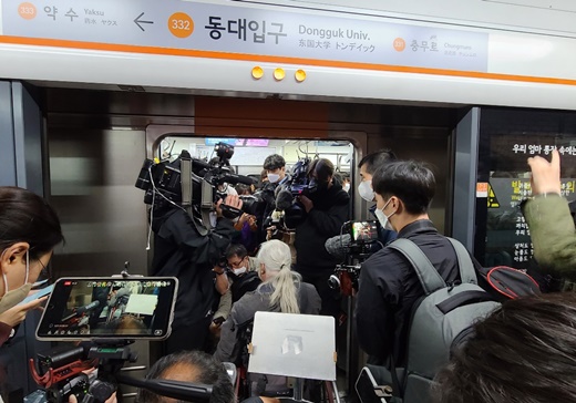 19일 오전 9시경 서울 3호선 동대입구역 약수 방면 승강장에 전국장애인차별철폐연대(전장연) 박경석 상임공동대표가 취재진들을 향해 지하철 승강장과 전동차 사이 넓은 단차의 위험성을 알리고 있다.ⓒ에이블뉴스 에이블포토로 보기▲ 19일 오전 9시경 서울 3호선 동대입구역 약수 방면 승강장에 전국장애인차별철폐연대(전장연) 박경석 상임공동대표가 취재진들을 향해 지하철 승강장과 전동차 사이 넓은 단차의 위험성을 알리고 있다.ⓒ에이블뉴스