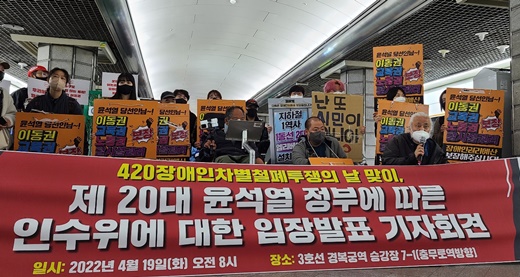 19일 오전 8시 3호선 경복궁역 승강장(7-1)에서 개최된 ‘제20회 장애인차별철폐의 날 맞이, 윤석열 정부 인수위에 대한 입장발표 기자회견’ 전경.ⓒ에이블뉴스 에이블포토로 보기▲ 19일 오전 8시 3호선 경복궁역 승강장(7-1)에서 개최된 ‘제20회 장애인차별철폐의 날 맞이, 윤석열 정부 인수위에 대한 입장발표 기자회견’ 전경.ⓒ에이블뉴스