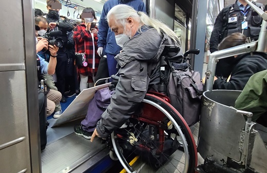 직접 수동휠체어를 몰아 앞바퀴가 빠지는 상황을 연출한 그는 지하철을 탄 시민들에게 “수없이 단차 문제 해결을 이야기했음에도 불구하고 왜 장애인은 이렇게 안전하지 못한 지하철을 이용하며 다쳐야 하냐”고 분통을 터뜨렸다.
