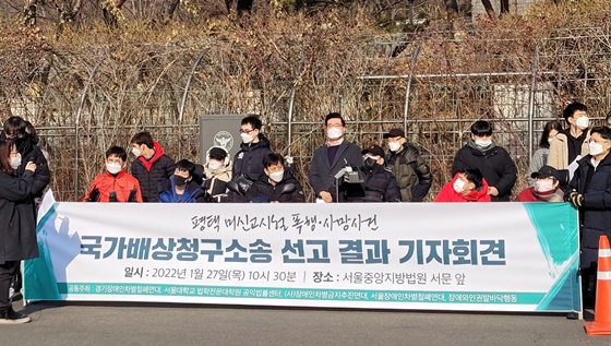 (사)장애인차별금지추진연대 등 5개 단체는 27일 서울중앙지방법원 앞에서 ‘평택 미신고시설 폭행·사망사건 국가배상청구소송 1심판결 선고’ 기자회견을 개최했다. ⓒ에이블뉴스 에이블포토로 보기▲ (사)장애인차별금지추진연대 등 5개 단체는 27일 서울중앙지방법원 앞에서 ‘평택 미신고시설 폭행·사망사건 국가배상청구소송 1심판결 선고’ 기자회견을 개최했다. ⓒ에이블뉴스