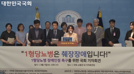 더불어민주당 서미화 의원이 작년 8월 7일 국회소통관에서 대한당뇨병연합, 대한당뇨병학회, 대한내분비학회 등 10개 단체와 ‘1형 당뇨병의 장애 인정 촉구’ 기자회견을 개최한 모습 ©국회방송