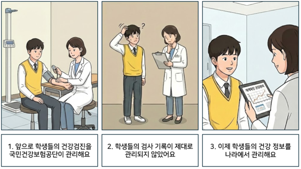 1. 앞으로 학생들의 건강검진을 국민건강보험공단이 관리해요. 2 학생들의 검사 기록이 제대로 관리되지 않았어요. 3 이제 학생들의 건강 정보를 나라에서 관리해요. ©AI 편집실