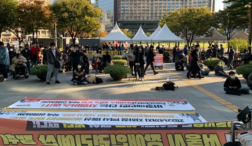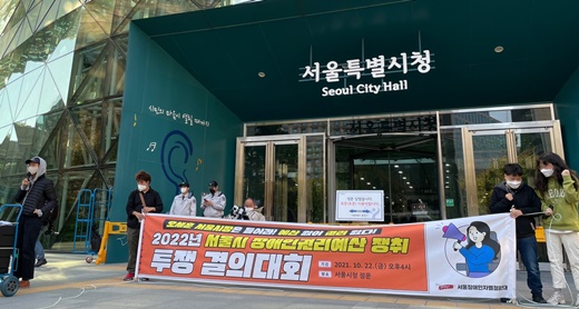 22일 서울시청 정문 앞에서 열린 ‘2022 서울시 장애인권리예산 쟁취 투쟁 결의대회’ 모습.ⓒ전국장애인차별철폐연대 에이블포토로 보기▲ 22일 서울시청 정문 앞에서 열린 ‘2022년 서울시 장애인권리예산 쟁취 투쟁 결의대회’ 모습.ⓒ전국장애인차별철폐연대