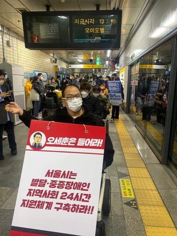 22일 서울시 장애인이동권예산 쟁취 지하철타기 직접행동을 펼치고 있는 장애인자립생활센터판 서기현 소장.ⓒ전국장애인차별철폐연대 에이블포토로 보기▲ 22일 서울시 장애인이동권예산 쟁취 지하철타기 직접행동을 펼치고 있는 장애인자립생활센터판 서기현 소장.ⓒ전국장애인차별철폐연대