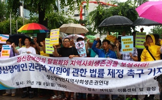 정신장애인지역사회생존권연대가 지난 2013년 7월 8일 이룸센터 앞에서 기자회견을 갖고 정신장애인 탈원화와 지역사회 생존권 보장를 촉구하고 있다.