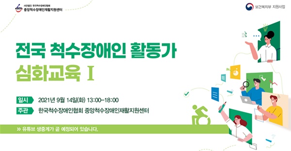 한국척수장애인협회 중앙척수장애인재활지원센터가 오는 14일부터 15일까지 ‘전국 척수장애인 활동가 심화교육’을 온라인 유튜브 생중계로 실시한다.ⓒ한국척수장애인협회 에이블포토로 보기▲ 한국척수장애인협회 중앙척수장애인재활지원센터가 오는 14일부터 15일까지 ‘전국 척수장애인 활동가 심화교육’을 온라인 유튜브 생중계로 실시한다.ⓒ한국척수장애인협회