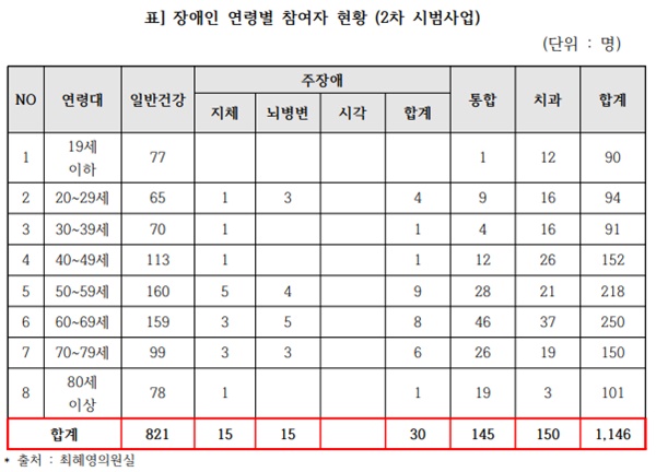 장애인 건강주치의 2차 시범사업 참여자 1146명으로 전체 등록장애인 0.1% 수준에 불과하다.ⓒ최혜영의원실 에이블포토로 보기▲ 장애인 건강주치의 2차 시범사업 참여자 1146명으로 전체 등록장애인 0.1% 수준에 불과하다.ⓒ최혜영의원실