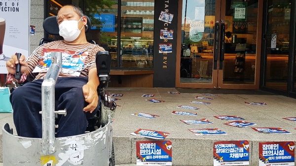 스타벅스 광화문점 턱 앞에 멈춘 이규식 서울장애인차별철폐연대 대표의 전동휠체어.ⓒ에이블뉴스DB 에이블포토로 보기▲ 스타벅스 광화문점 턱 앞에 멈춘 이규식 서울장애인차별철폐연대 대표의 전동휠체어.ⓒ에이블뉴스DB