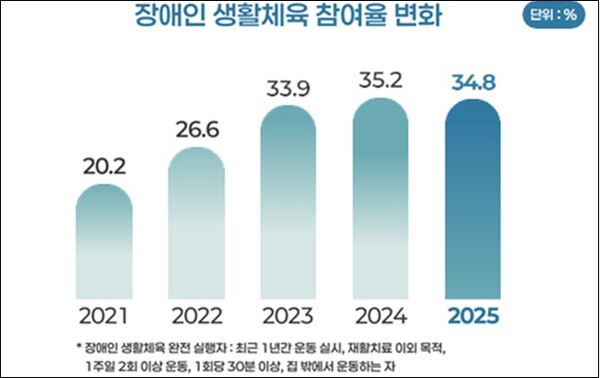 2025년도 장애인 생활체육 참여율은 34.8%로 조사돼 전년 대비 0.4%포인트(p) 소폭 감소했다.