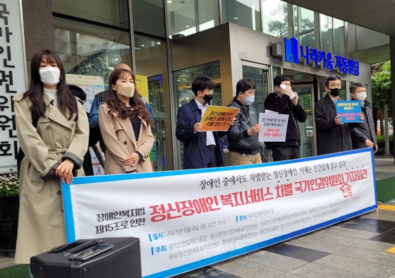 장애우권익문제연구소 등 11개 단체는 지난 5월 4일 오전 11시 인권위 앞에서 ‘장애인복지법 제15조로 인한 정신장애인 복지서비스 차별 진정’ 기자회견을 개최했다. ⓒ에이블뉴스DB 에이블포토로 보기▲ 장애우권익문제연구소 등 11개 단체는 지난 5월 4일 오전 11시 인권위 앞에서 ‘장애인복지법 제15조로 인한 정신장애인 복지서비스 차별 진정’ 기자회견을 개최했다. ⓒ에이블뉴스DB