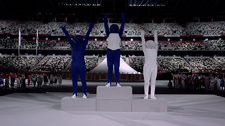 도쿄 올림픽 개막식 공연인 '픽토그램 쇼' 중 마지막 장면인 '시상식'을 형상화 한 장면. ⓒ2020 도쿄 올림픽/패럴림픽 공식 트위터 에이블포토로 보기▲ 도쿄 올림픽 개막식 공연인 '픽토그램 쇼' 중 마지막 장면인 '시상식'을 형상화 한 장면. ⓒ2020 도쿄 올림픽/패럴림픽 공식 트위터