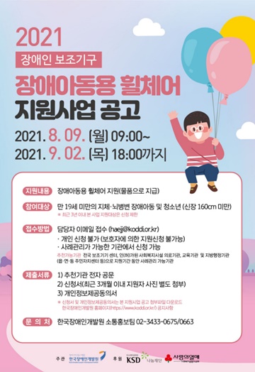2021년 장애인 보조기구(장애아동용 휠체어) 지원사업 포스터.ⓒ한국장애인개발원 에이블포토로 보기▲ 2021년 장애인 보조기구(장애아동용 휠체어) 지원사업 포스터.ⓒ한국장애인개발원