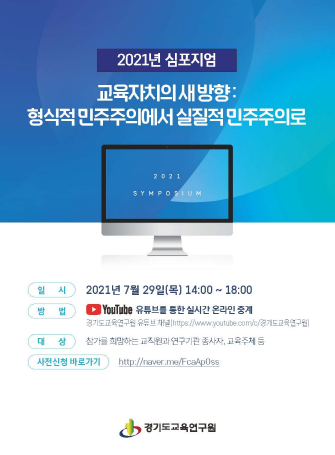 [한국장애인뉴스 이남일 기자] 경기도교육연구원은 오는 29일 오후 2시 유튜브 채널을 통해 '교육자치의 새 방향 : 형식적 민주주의에서 실질적 민주주의로'를 주제로 2021년 심포지엄을 개최한다.