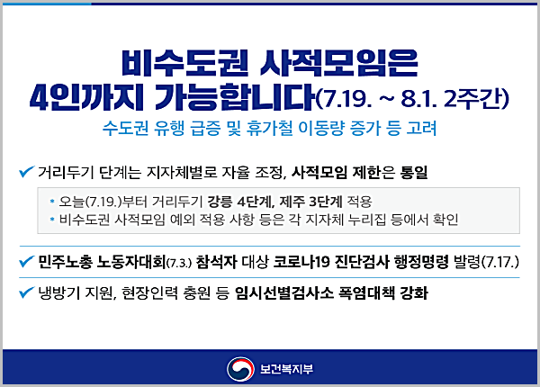 이외에 중앙재난안전대책본부에서는 ‘비수도권 사적모임 제한 조정방안’을 논의하고, 7월 19일(월) 0시부터 8월 1일(일) 24시까지 2주간 비수도권 전체에 대해 사적모임을 4명까지 허용하기로 했다.