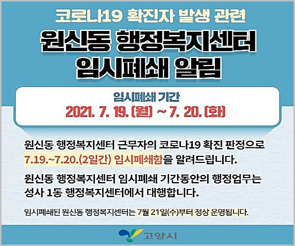 원신동 행정복지센터에서 확진자 1명이 추가 발생하여 19일부터 20일까지 이틀간 원신동 행정복센터를 임시폐쇄하고 접촉자 13명은 30일까지 자가격리 및 재택근무에 들어갔다. 덕양구는 청사소독을 실시하고 청사폐쇄로 인한 시민불편을 최소화하기 위해 21일부터 민원처리 인력 5명을 지원하여 행정복지센터를 운영할 예정이다.