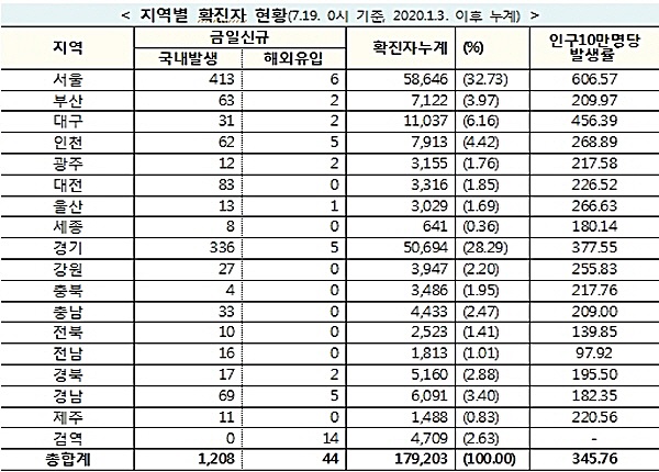 한편, 중앙방역대책본부는 19일 0시 기준으로 국내 발생 신규 확진자는 1,208명, 해외유입 사례는 44명이 확인되어 총 누적 확진자 수는 179,203명(해외유입 10,940명)이라고 밝혔다.