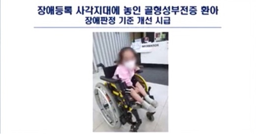 이날 강선우 의원은 11살 골형성부전증 환아의 휠체어 탄 사진을 공개하며 “사진 속 아동은 나이가 어리다는 이유로, 팔, 다리를 펼 수 있다는 이유로 장애를 인정받지 못하고 있다’고 했다.