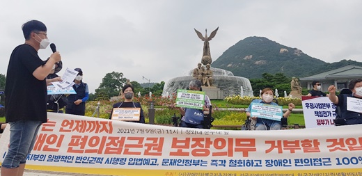 장애인차별금지추진연대(장추련) 등은 9일 청와대 분수대 앞에서 기자회견을 갖고, 복지부의 일방적인 ‘장애인·노인·임산부 등의 편의증진 보장에 관한 법률(장애인등편의법)’ 시행령 개정안 입법예고를 즉각 철회해야 한다고 촉구했다.