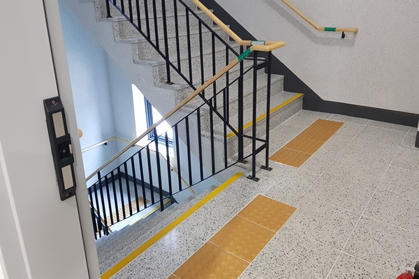 건물 내부 계단 양쪽에는 시각장애인이 손끝으로 만져 층수를 알 수 있는 점자표지판이 부착된 손잡이, 계단 입구 바닥에 점자블록이 양호하게 설치돼 있다.