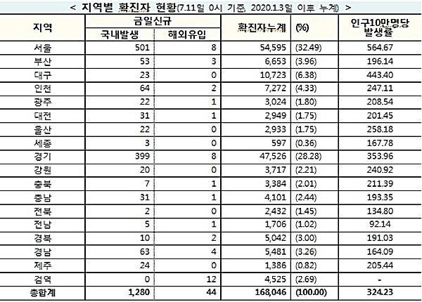 한폄, 중앙방역대책본부는 11일 0시 기준으로 국내 발생 신규 확진자는 1,280명, 해외유입 사례는 44명이 확인되어 총 누적 확진자 수는 168,046명(해외유입 10,551명)이라고 밝혔다.