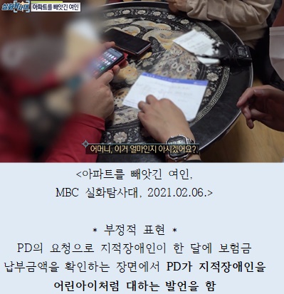 MBC ‘실화탐사대’ 속 장애인에 대한 부정적 인식 영향을 준 내용.ⓒ장애인정책모니터링센터 에이블포토로 보기▲ MBC ‘실화탐사대’ 속 장애인에 대한 부정적 인식 영향을 준 내용.ⓒ장애인정책모니터링센터
