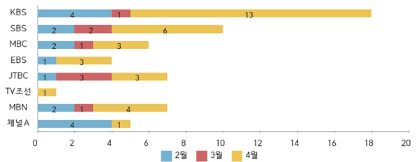 방송사별 월별 장애 관련 보도 수.ⓒ장애인정책모니터링센터 에이블포토로 보기▲ 방송사별 월별 장애 관련 보도 수.ⓒ장애인정책모니터링센터