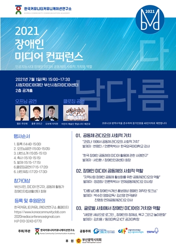 제2회 장애인 미디어 컨퍼런스가 오는 7월 1일 오후 3시 부산시청자미디어센터 공개홀에서 개최된다.