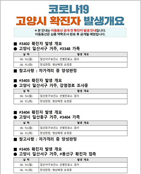전날인 14일에는 7명이 코로나19 확진판정을 받았는데 감염원인은 타지역 확진자 접촉 3명, 가족 간 감염 2명, 지인 접촉 2명이다. 거주지별로 분류하면 덕양구 주민 3명, 일산동구 주민 2명, 일산서구 주민 1명, 타지역 1명이다.