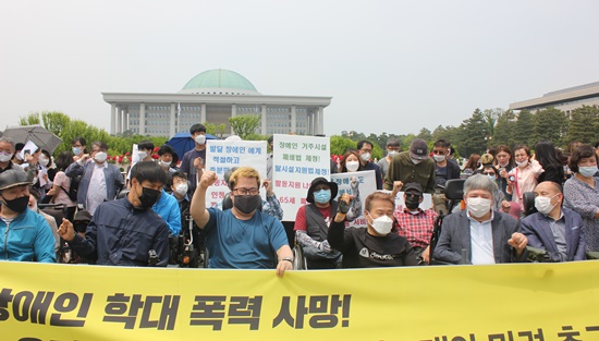한국장애인자립생활센터총연합회, 한국장애인단체총연합회, 한국장애인연맹이 2020년 5월 26일 국회 앞에서 장애청년 학대 폭력 사망 사건에 대한 법적 처벌과 정부의 적극적인 대안 마련을 촉구하는 모습.ⓒ에이블뉴스 에이블포토로 보기▲ 한국장애인자립생활센터총연합회, 한국장애인단체총연합회, 한국장애인연맹이 2020년 5월 26일 국회 앞에서 장애청년 학대 폭력 사망 사건에 대한 법적 처벌과 정부의 적극적인 대안 마련을 촉구하는 모습.ⓒ에이블뉴스