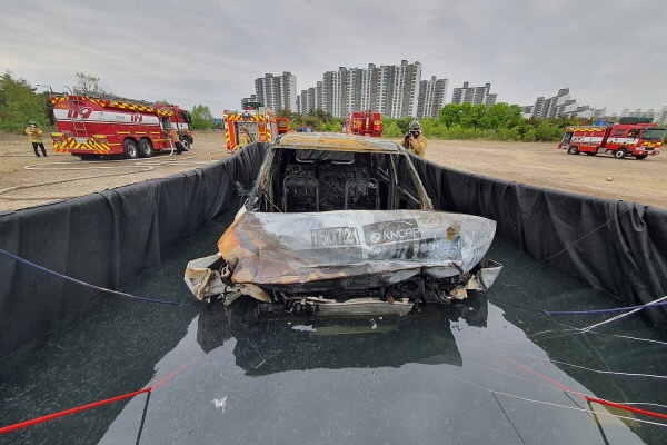 소방서는 이러한 전기자동차의 특성에 맞춘 화재진압 대책 마련을 위해 ‘조립식 수조’를 활용하여 화재를 진압하는 방법을 모색하였고, 화재 발생 시 초기 화재를 진압한 뒤 화세가 안정되었을 때 소방차 크레인이나 지게차를 사용하여 차량을 수조에 침수시켜 화재를 완전히 진압하는 실험을 진행하였다.