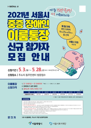 에이블포토로 보기▲ 2021년 서울시 중증장애인 이룸통장 신규 참가자 모집 안내. ⓒ서울시
