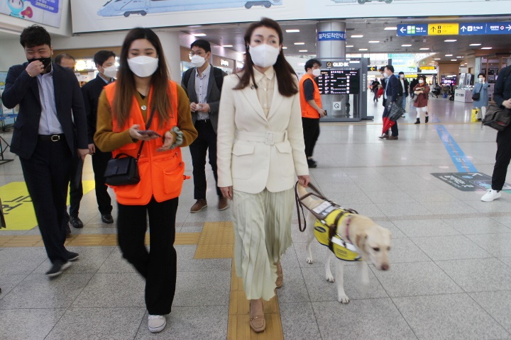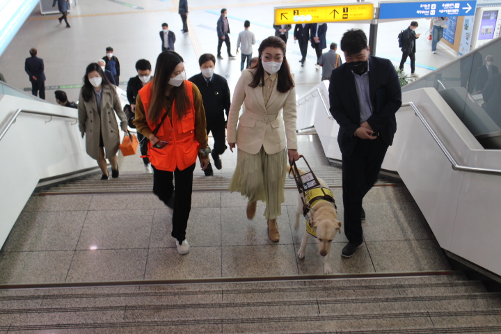 시각장애인당사자인 김예지 의원은 휴먼케어 직원의 안내를 받아 무선 이어폰 에서 들리는 안내음성 소리에 바닥에 설치된 점자블록을 따라 안내견 조이와 함께 3층 화장실 앞에서 출발해 1층 KTX 13·14번 승강장 위 계단 앞을 돌아 다시 3층 맞이방으로 되돌아 왔다. 소요 시간은 30분 정도 걸렸다.