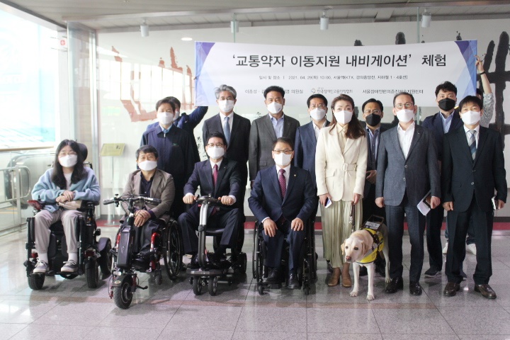 이날 이종성·김예지 의원을 비롯해 시각장애인 3명, 지체장애인 5명이 실내 내비게이션 기술을 활용해 서울역 맞이방 내부를 이동하는 체험을 했다.