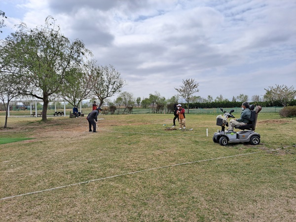 4월 초 장애인파크골프협회에서 노가다를 한다는 얘기를 듣고 필자도 음료수와 간식을 사 들고 삼락파크골프장을 가 보았다. 장애인 회원들이 여러 가지 실험을 하면서 그린인조잔디가 너무 가파른 곳에 있으면 휠체어 장애인이 공을 치기 어려운 점 등 여러 가지 문제점이 발견되어 티박스와 그린인조잔디를 여러 번 옮겨야 했다.