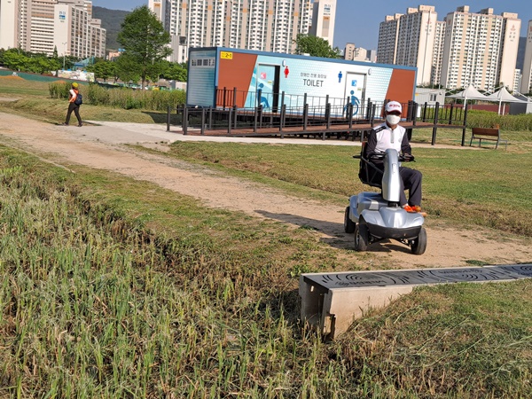 “화장실 안에 자리도 많던데 손 씻는 곳이 없었어요.” 장애인전용 화장실 입구에도 차광막(가림천막)이 있었으면 좋겠다고 했다. 장애인파크골프 이정웅 회장은 기존의 9홀에서 신설된 9홀이나 장애인 화장실로 건너가려면 –예전에는 그사이에 건널 수 없는 깊은 도랑이 있었는데, 파크골프장을 신설하면서 군데군데 커다란 관을 묻어서 쉽게 건너갈 수 있게 해 놓았지만 – 빙 돌아가는 게 아니라 바로 건너갈 수 있도록 관을 하나 더 묻어 줬으면 좋겠다고 했다.