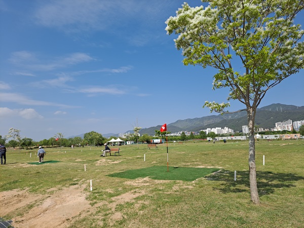 이번에 개설된 삼장파크골프장(가칭)은 기존 9홀이 9,800제곱미터이고, 이번에 신설된 구장이 12.000제곱미터란다.