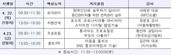 교육은 22일과 23일 양일간 경력 1년 이상인 장애인단체 실무자(1년 미만의 경력자도 신청 가능)를 대상으로 유튜브 실시간 라이브 방식으로 성과관리, 자원연계, 프로포절, 홍보‧PR 총 4가지 핵심직무역량을 주제로 운영된다.