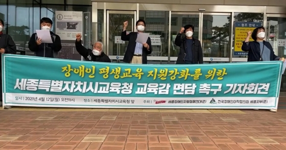 세종장애인차별철폐연대은 12일 오전 11시 세종특별자치시교육청 앞에서 ‘장애인 평생교육 지원강화를 위한 세종특별자치시교육청 교육감 면담 촉구’ 기자회견을 개최했다. ⓒ세종장애인차별철폐연대 에이블포토로 보기▲ 세종장애인차별철폐연대은 12일 오전 11시 세종특별자치시교육청 앞에서 ‘장애인 평생교육 지원강화를 위한 세종특별자치시교육청 교육감 면담 촉구’ 기자회견을 개최했다. ⓒ세종장애인차별철폐연대