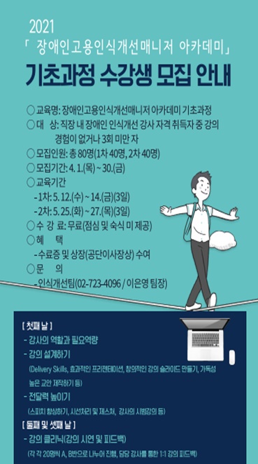 ‘장애인고용인식개선매니저 아카데미 기초과정’ 수강생을 이달 말까지 모집한다.ⓒ한국장애인고용안정협회 에이블포토로 보기▲ ‘장애인고용인식개선매니저 아카데미 기초과정’ 수강생을 이달 말까지 모집한다.ⓒ한국장애인고용안정협회
