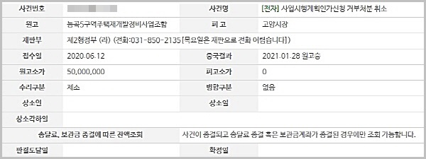 이처럼 해결의 기미가 보이지 않자 능곡5구역 조합측은 고양시의 사업시행계획인가 거부처분은 △절차상의 하자·보완 요구 없는 일방적인 처분으로 위법하고 △재량권의 일탈·남용이며 △조합이 시공자와 체결한 공사도급계약에 따라 (공사착공 지연으로 인해)매월 10억 원에 이르는 손실이 계속되어 귀책사유가 없는 조합과 조합원들에 막대한 재산상의 손해를 입고 있다는 취지의 ‘사업시행계획인가신청 거부처분 취소’ 소송 제기했고, 지난 1월 28일 의정부지방법원 제2행정부는 원고 승소 판결을 내렸다.