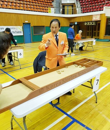 장애인체육대회 슐런종목 경기에서 농인선수에게 20 이라는 숫자의 채점을 수어로 판정해 주는 심판인 필자. ⓒ김최환 에이블포토로 보기▲ 장애인체육대회 슐런종목 경기에서 농인선수에게 20 이라는 숫자의 채점을 수어로 판정해 주는 심판인 필자. ⓒ김최환