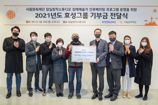 22일 진행된 ‘2021년도 효성그룹 기부금 전달식’에 참석한 김종휘 서울문화재단 대표이사(왼쪽에서 다섯 번째).ⓒ서울문화재단 에이블포토로 보기▲ 22일 진행된 ‘2021년도 효성그룹 기부금 전달식’에 참석한 김종휘 서울문화재단 대표이사(왼쪽에서 다섯 번째).ⓒ서울문화재단서울문화재단은 효성그룹으로부터 기부 받은 1억 원으로 장애예술가를 위한 창작공간인 잠실창작스튜디오의 ‘굿모닝 스튜디오’ 사업을 진행한다고 23일 밝혔다.