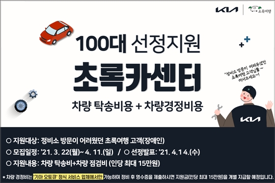 이번 서비스는 초록여행의 장애인 고객을 위해 마련됐으며 전문기사(탁송) 서비스 비용과 간단한 점검, 엔진오일 및 에어필터 교체 등 차량 경정비 비용을 합쳐 최대 15만 원이 지원된다.